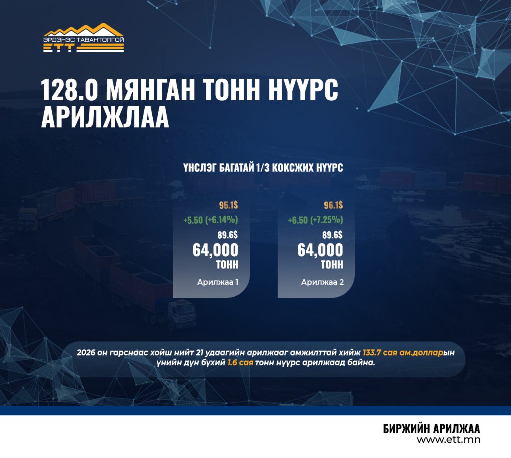 2026 онд 21 удаагийн арилжаагаар 133.7 сая ам.долларын үнийн дүн бүхий 1.6 сая тонн нүүрс арилжлаа.