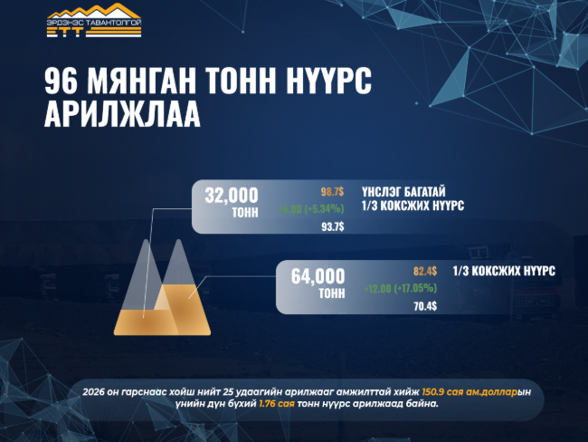 2026 онд 25 удаагийн арилжаагаар 150.9 сая ам.долларын үнийн дүн бүхий 1.76 сая тонн нүүрс арилжлаа.
