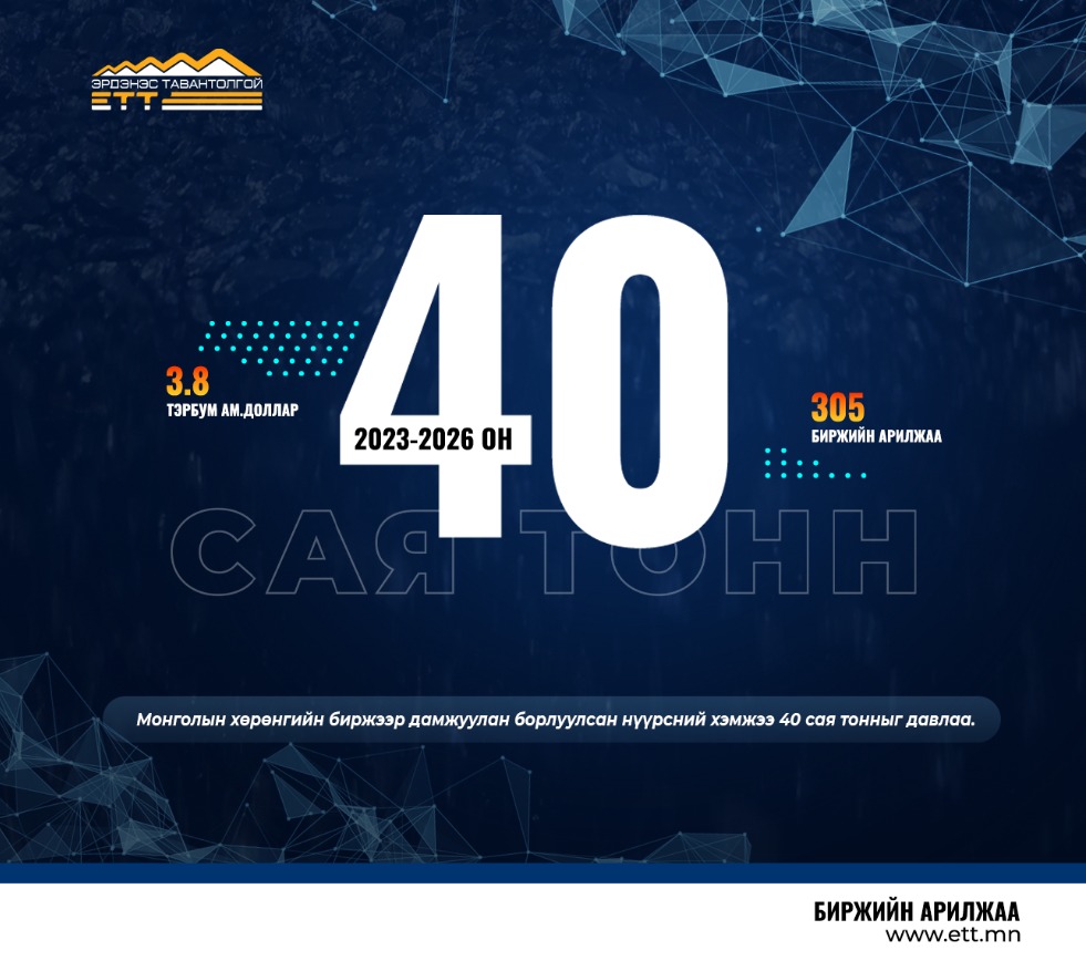 “Эрдэнэс Тавантолгой” ХК 2026 оны 03 дугаар сарын 05-ны өдөр Монголын Хөрөнгийн Биржээр дамжуулан 1 удаагийн амжилттай арилжаагаар 64.0 мянган тонн нүүрсийг нийт 3.9 сая ам.долларын үнийн дүнтэйгээр БНХАУ-ын боомт хүргэж өгөх нөхцөлөөр арилжааллаа.