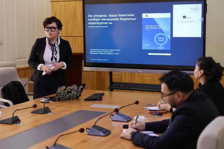 Уулзалтын үеэр Аж үйлдвэр, эрдэс баялгийн салбарын Жендерийн салбар зөвлөлийн гишүүн, Эрдэс баялаг, эмэгтэйчүүдийн холбооны гүйцэтгэх нарийн бичгийн дарга О.Туяа уул уурхайн салбарт хүний эрхийг хүндэтгэх, жендерийн эрх тэгш байдлыг хангах, хариуцлагатай уул уурхайг хөгжүүлэхэд салбар зөвлөлийн үүрэг оролцоо, хүрэх үр дүнгийн тухай танилцуулга хийлээ.
