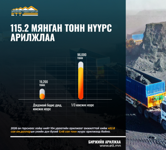 2026 онд 104 удаагийн арилжаагаар 452.8 сая ам.долларын үнийн дүн бүхий 5.46 сая тонн нүүрс арилжлаа.