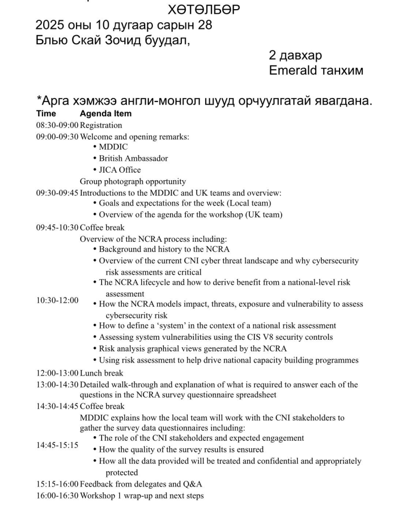 Цахим хөгжил, инновац, харилцаа холбооны яамнаас Их Британийн Засгийн газартай хамтран Монгол Улсын кибер аюулгүй байдлын эрсдэлийг тодорхойлох судалгааг 2025 оны 10 дугаар сарын 28-ны өдөр зохион байгуулахаар ажиллаж байна.
